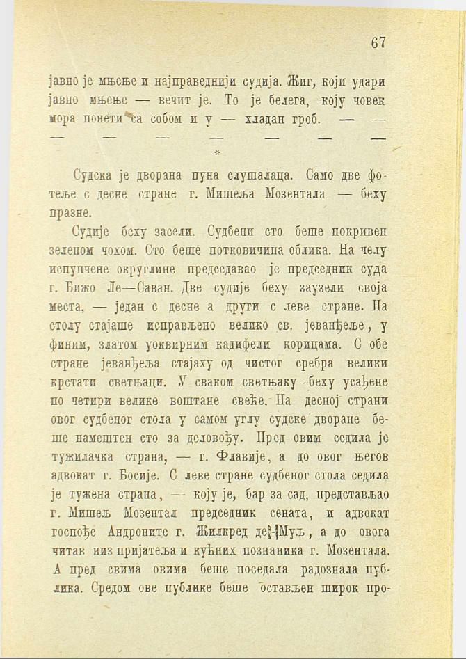 Судије беху засели. Судбени сто беше покривен зеленом чохом. Сто беше потковичина облика. На челу испупчене округлине председавао је председник суда г. Бижо Ле—Саван. Две судије беху заузели своја места, — један с десне а други с леве стране. На столу стајаше исправљено велико св. јеванђеље, у финим, златом уоквирним кадифели корицама. С обе стране јеванђеља стајаху од чистог сребра велики крстати светњаци. У сваком светњаку - беху усађене по четири велике воштане свеће. На десној страни овог судбеног стола у самом углу судске дворане беше намештен сто за деловођу. Пред овим седила је тужилачка страна, — г. Флавије, а до овог његов адвокат г. Босије. С леве стране судбеног стола седила је тужена страна, — коју је, бар за сад, представљао г. Мишељ Мозентал председник сената, и адвокат госпође Андроните г. Жилкред де-Муљ, а до овога читав низ пријатеља и кућних познаника г. Мозентала. А пред свима овима беше поседала радознала публика. Средом ове публике беше остављен широк пролаз.