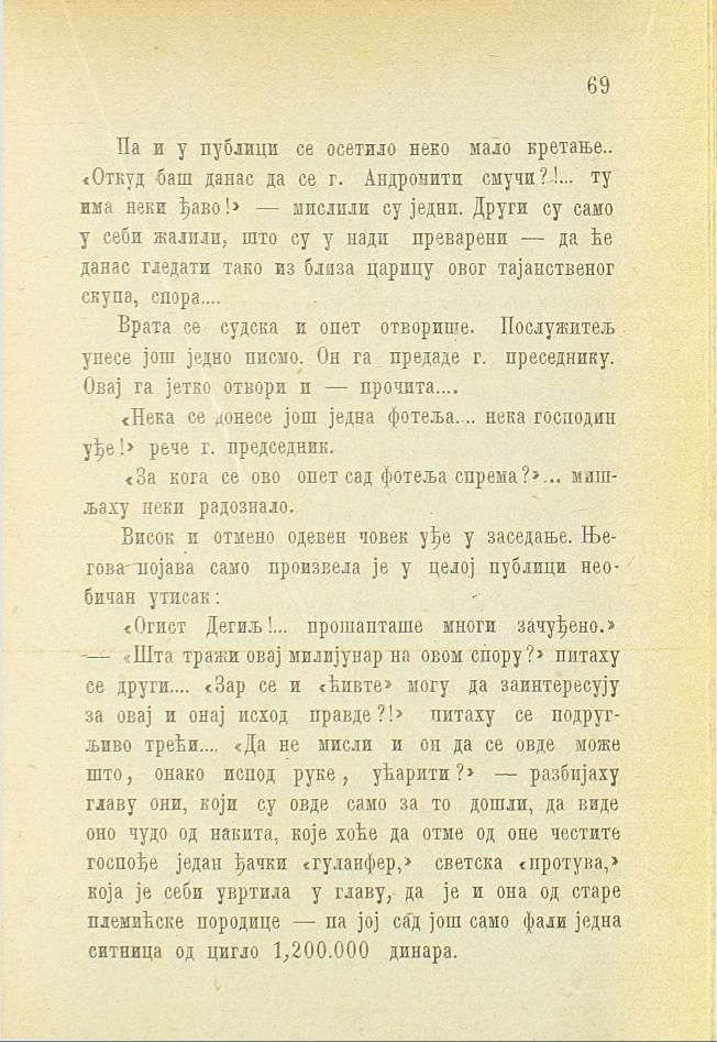 — «Шта тражи овај милијунар на овом спору?» питаху се други.... «3ар се и «ћивте» могу да заинтересују за овај и онај исход правде?!» питаху се подругљиво трећи.... «Да не мисли и он да се овде може што, онако испод руке, ућарити?» — разбијаху главу они, који су овде само за то дошли, да виде оно чудо од накита, које хоће да отме од оне честите госпође један ђачки «гуланфер» светска «протува,» која је себи увртила у главу, да је и она од старе племићске породице — па јој сад још само фали једна ситница од цигло 1,200.000 динара.