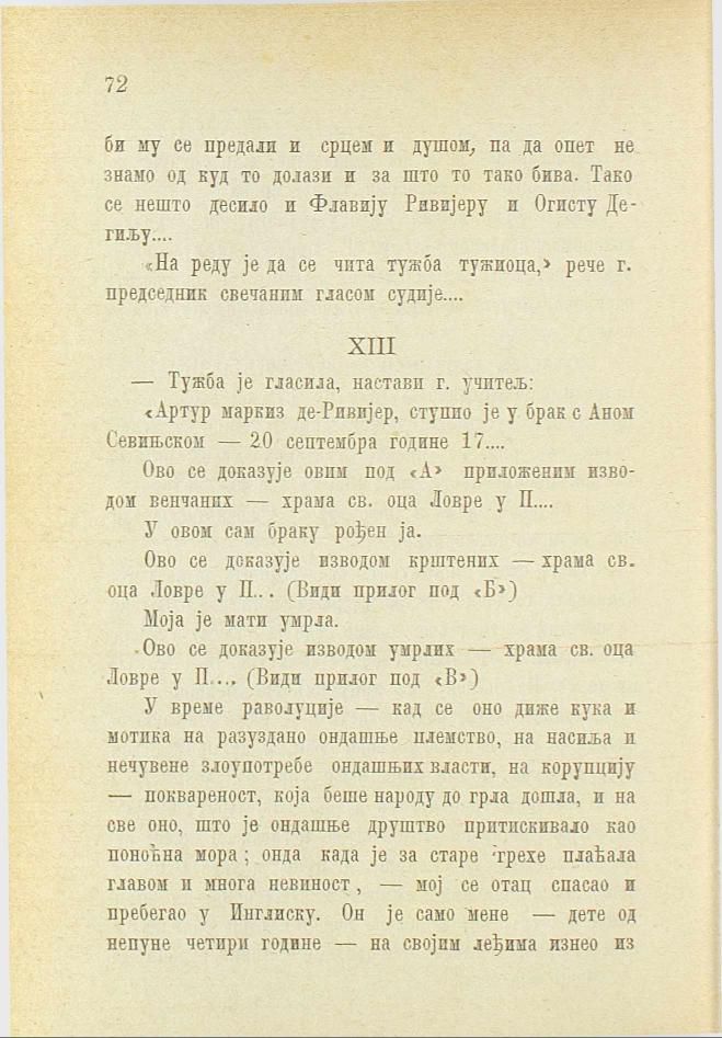 У време револуције — кад се оно диже кука и мотика на разуздано ондашње племство, на насиља и нечувене злоупотребе ондашње власти, на корупцију — поквареност, која беше народу до грда дошла, и на све оно, што је ондашње друштво притискивало као поноћна мора; онда када је за старе грехе плаћала главом и многа невиност, — мој се отац спасао и пребегао у Инглиску. Он је само мене — дете од непуне четири године — на својим леђима изнео из