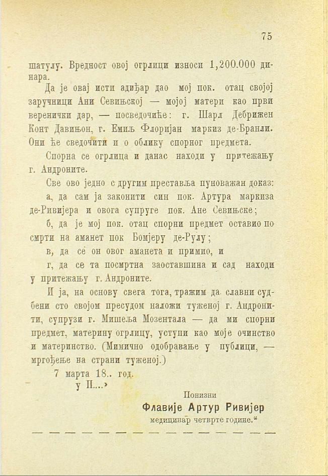 Да је овај исти адиђар дао мој пок. отац својој заручници Ани Севињској — мојој матери као први веренички дар, — посведочиће: г. Шарл Дебрижен Конт Давињон, г. Емиљ Флоријан маркиз де-Бранли. Они ће сведочити и о облику спорног предмета.