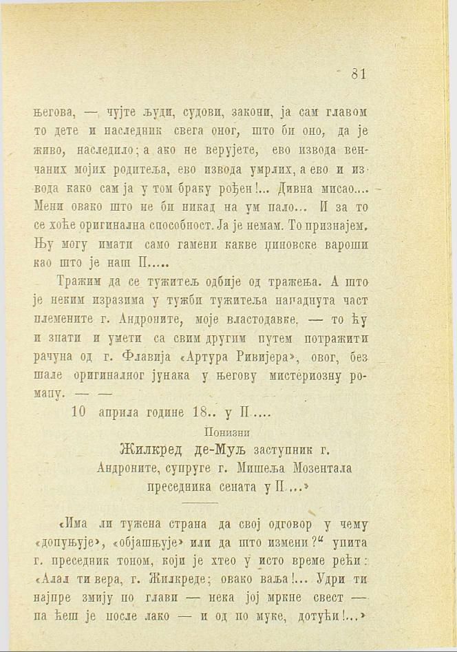 Тражим да се тужитељ одбије од тражења. А што је неким изразима у тужби тужитеља нападнута част племените г. Андроните, моје властодавке, — то ћу и знати и умети са свим другим путем потражити рачуна од г. Флавија «Артура Ривијера», овог, без шале оригиналног јунака у његову мистериозну роману. — —
