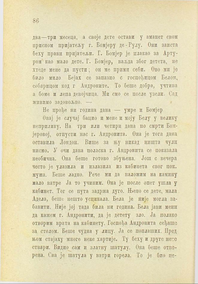 Овај је случај бацио и мене и моју Белу у велику неприлику. На три или четири дана по смрти Бомјеровој, отпусти нас г. Андронита. Она је тога дана оставила Лондон. Више за њу никад ништа чули нисмо. У очи дана поласка г. Андронита се показала необична. Она беше готово збуњена. Још с вечера често је улазила и излазила из кабинета свог пок. мужа. Беше ладно. Рече ми да наложим на камину мало ватре Ја то учиним. Она је после опет ушла у кабинет. Тог се пута задржа дуго. Њено се дете, мала Адела, беше нешто усцикала. Бела је није могла забавити. Није јој тада била ни година. Бела јави мени да кажем г. Андронити, да је детету зло. Ја полако отворим врата на кабинету. Госпођа Андронита сеђаше за столом. Беше чудна у лицу. Ја се поплаших. Пред њом стајаху многе неке хартије. Ту беху и друге неке ствари. Видио сам и златну шатулу. Она беше отворена. Сва је шатула у ватри горела. То је био некакви