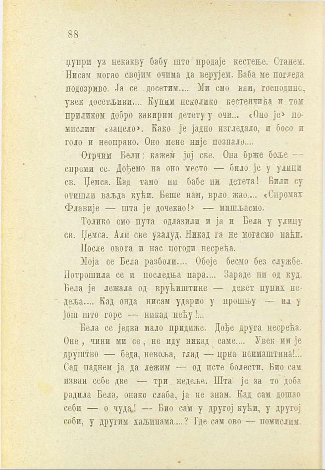 Моја се Бела разболи.... Обоје бесмо без службе. Потрошила се и последња пара.... Зараде ни од куд. Бела је лежала од врућиштине — девет пуних недеља.... Кад онда нисам ударио у прошњу — ил у још што горе — никад нећу!...