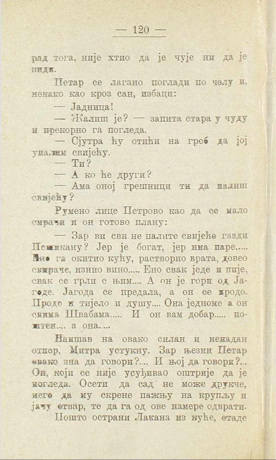 — Зар ви сви не палите свијеће газди Пешикану? Јер је богат, јер има паре... Ено га окитио кућу, растворио врата, довео свираче, изнио вино Ено свак једе и пије, свак се грли с њим.... А он је гори од Јагоде. Јагода се предала, а он се продо. Продо и тијело и душу.... Она једноме а он свима Швабама... И он вам добар... поштен.... а она.