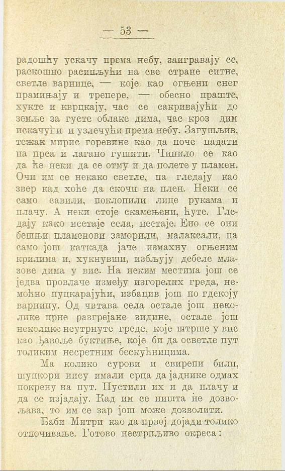 радошћу ускачу према небу, заигравају се, раскошно расипљући на све стране ситне, светле варнице, — које као огњени снег прамињају и трепере, — обесно праште, хукте и кврцкају, час се сакривајући до земље за густе облаке дима, час кроз дим искачући и узлечући према небу. Загушљив, тежак мирис горевине као да поче падати на прса и лагано гушити. Чинило се као да ће неки да се отму и да полете у пламен. Очи им се некако светле, па гледају као звер кад хоће да скочи на плен. Неки се само савили, поклопили лице рукама и плачу. А неки стоје скамењени, ћуте. Гледају како нестаје села, нестаје. Ено се они бешњи пламенови заморили, малаксали, па само још каткада јаче измахну огњеним крилима и, хукнувши, избљују дебеле млазове дима у вис. На неким местима још се једва провлаче између изгорелих греда, немоћно пуцкарајући, избацив још по гдекоју варницу. Од читава села остале још неколике црне разгрејане зидине, остале још неколике неутрнуте греде, које штрше у вис као ђавоље буктиње, које би да осветле пут толиким несретним бескућницима.