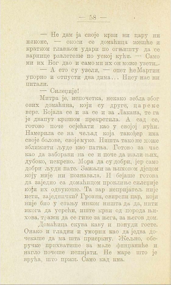 — Не дам ја своје крви ни цару ни никоме, — окоси се домаћица жешће и кратком главњом удари по огњишту да се варнице разлетеше по уској кући. — Само ми их Бог дао и само ми их он може узети...