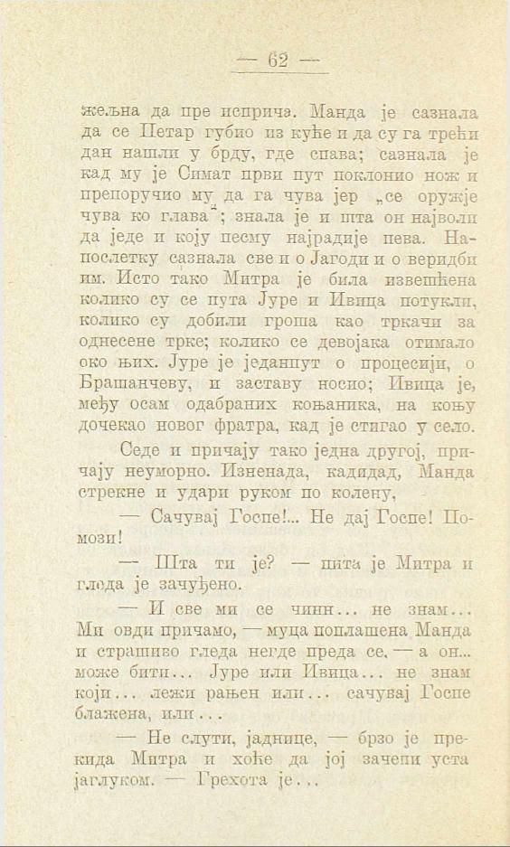 жељна да пре исприча. Манда је сазнала да се Петар губио из куће и да су га трећи дан нашли у брду, где спава; сазнала је кад му је Симат први пут поклонио нож и препоручио му да га чува јер „се оружје чува ко глава“; знала је и шта он најволи да једе и коју песму најрадије пева. Напослетку сазнала све и о Јагоди и о веридби им. Исто тако Митра је била извешћена колико су се пута Јуре и Ивица потукли, колико су добили гроша као тркачи за однесене трке; колико се девојака отимало око њих. Јуре је једанпут о процесији, о Брашанчеву, и заставу носио; Ивица је, међу осам одабраних коњаника, на коњу дочекао новог фратра, кад је стигао у село.