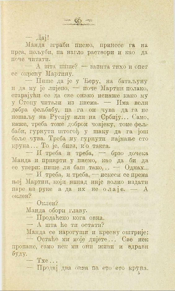 — Пише да је у Ђеру, на батаљуну и да му је лијепо, — поче Мартин полако, старајући се да све онако искаже како му у Стоцу читали из писма. — Има вели добра фељбабу, па га он чува да га не пошаљу на Русију или на Србију... Само, каже, треба томе добром човјеку, томе фељбаби, гурнути штогођ у шаку да га још боље чува. Треба му гурнути најмање сто круна... То је, бива, к'о такса.