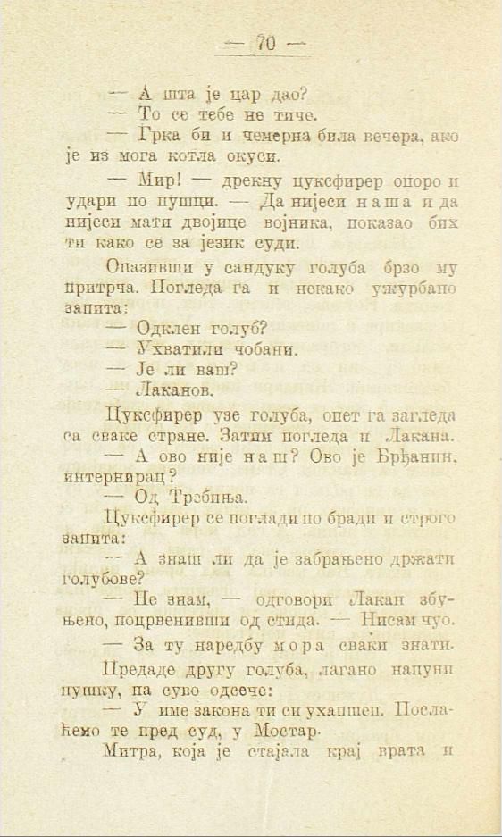 — Мир! — дрекну цуксфирер опоро и удари по пушци. — Да нијеси наша и да нијеси мати двојице војника, показао бих ти како се за језик суди.