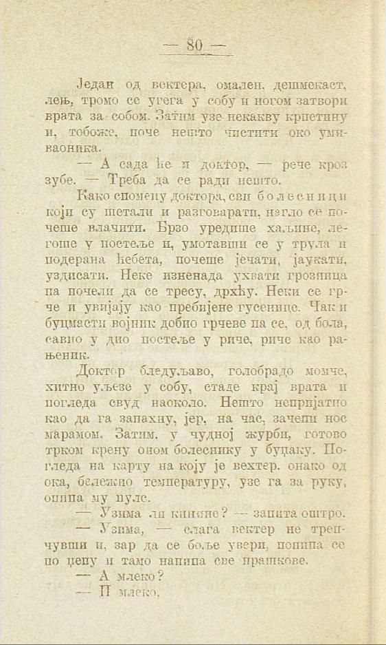 Како спомену доктора, сви болесници који су шетали и разговарати, нагло се почеше влачити. Брзо уредише хаљине, легоше у постеље и, умотавши се у трула и подерана ћебета, почеше јечати, јаукати, уздисати. Неке изненада ухвати грозница па почели да се тресу, дрхћу. Неки се грче и увијају као пребијене гусенице. Пак и буцмасти војник добио грчеве па се, од бола, савио у дио постеље у риче, риче као рањеник.