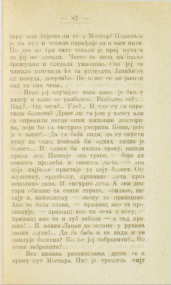 или спрема ли се у Мостар? Излазила је на пут и чекала кириђије да и њих пита. По два по три сата чекала је крај пута а да јој не досади. Често се пела на какав брежуљак и гледала унаоколо. Све јој се чинило изненада ће га угледати. Јавиће се од некуда, дотрчаће. Не може се не јавити кад га ова чека... .
