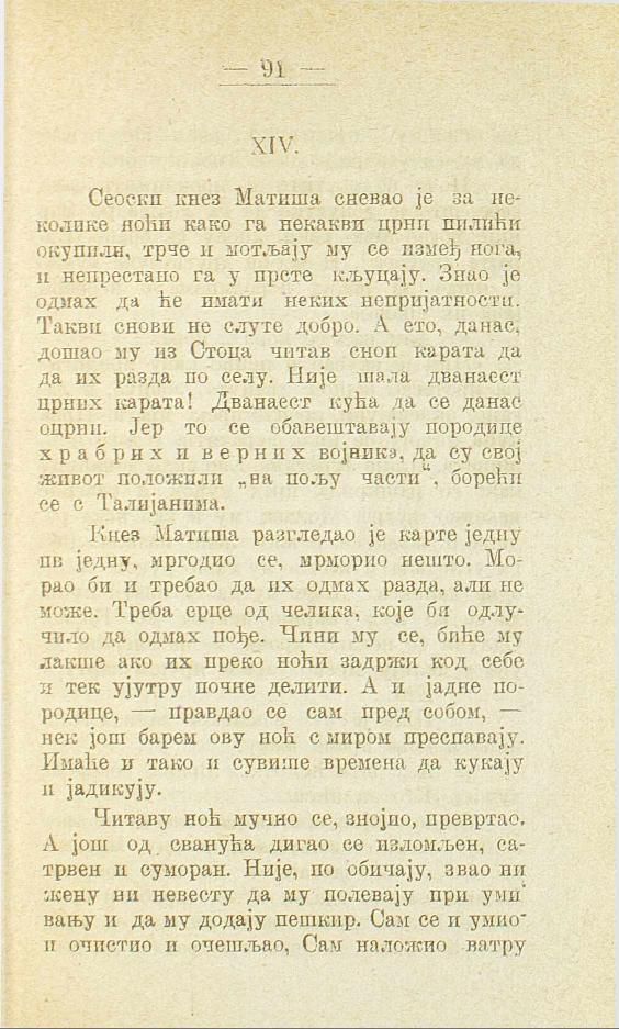 Кнез Матиша разгледао је карте једну по једну, мргодио се, мрморио нешто. Морао би и требао да их одмах разда, али не може. Треба срце од челика, које би одлучило да одмах пође. Чини му се, биће му лакше ако их преко ноћи задржи код себе и тек ујутру почне делити. А и јадне породице, — правдао се сам пред собом, — нек још барем ову ноћ с миром преспавају. Имаће и тако и сувише времена да кукају и јадикују.