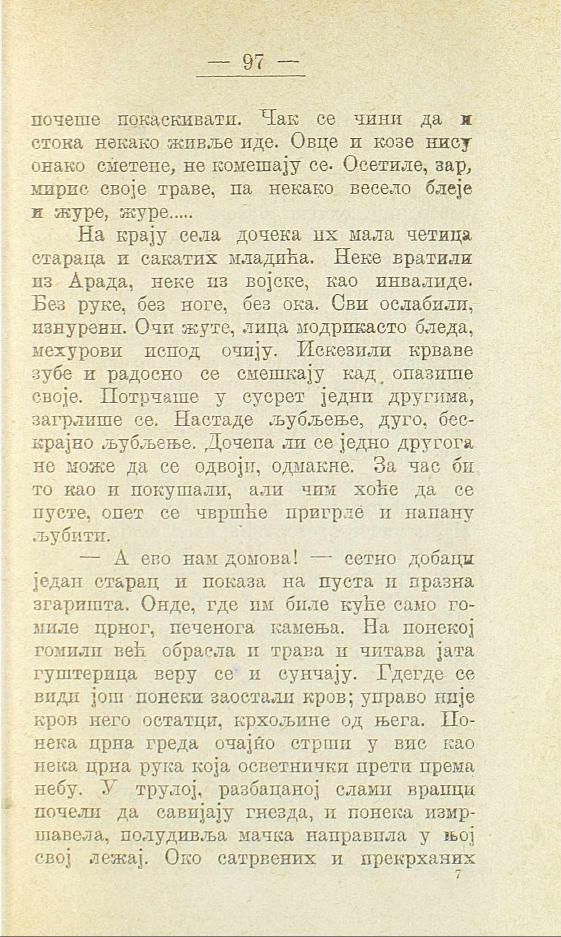 — А ево нам домова! — сетно добаци један старац и показа на пуста и празна згаришта. Онде, где им биле куће само гомиле црног, печенога камења. На понекој гомили већ обрасла и трава и читава јата гуштерица веру се' и сунчају. Гдегде се види још понеки заостали кров; управо није кров него остатци, крхољине од њега. Понека црна греда очајно стрши у вис као нека црна рука која осветнички прети према небу. У трулој, разбацаној слами врапци почели да савијају гнезда, и понека измршавела, полудивља мачка направила у њој свој лежај. Око сатрвених и прекрханих