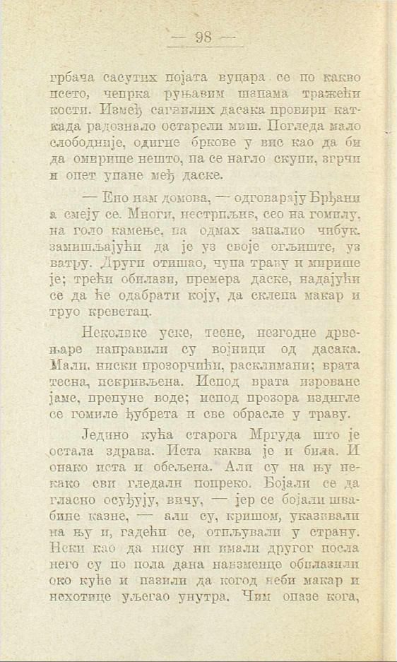 Једино кућа старога Мргуда што је остала здрава. Иста каква је и била, И онако иста и обељена. Али су на њу некако сви гледали попреко. Бојали се да гласно осуђују, вичу, — јер се бојали швабине казне, — али су, кришом, указивали на њу и, гадећи се, отпљували у страну. Неки као да нису ни имали другог посла него су по пола дана наизменце обилазили око куће и пазили да когод неби макар и нехотице уљегао унутра. Чим опазе кога,