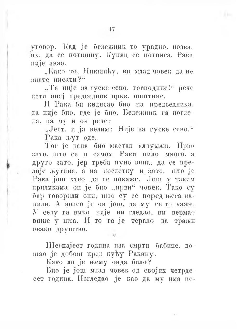 Тог је дана био мастан алдумаш. Прво зато, што се и самом Раки пило много, а друго зато, јер треба пуно вина, да се прелије љутина, а на послетку и зато, што је Рака још хтео да се покаже. Још у таким приликама он је био„први” човек. Тако су бар говорили они, што су се поред њега напили. А волео је он још, да му се то каже. У селу га нико није ни гледао, ни вермао више у шта. И то га је терало да тражи овако друштво.