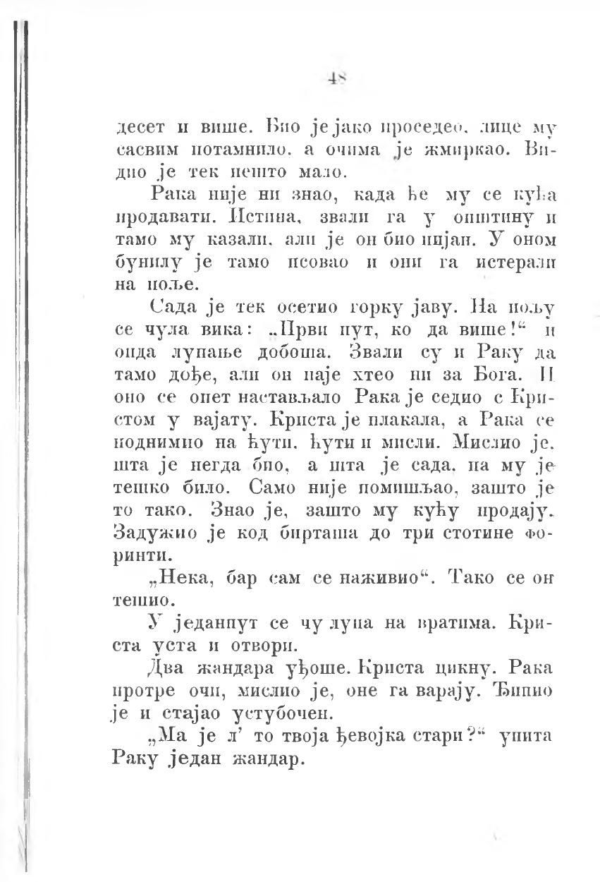 Сада је тек осетио горку јаву. На пољу се чула вика: „Први пут, ко да више!” и онда лупање добоша. Звали су и Раку да тамо дође, али он није хтео ни за Бога. И оно се опет настављало. Рака је седио с Кристом у вајату. Криста је плакала, а Рака се поднимио па ћути, ћути и мисли. Мислио је, шта је негда био, а шта је сада, па му је тешко било. Само пије помишљао, зашто је то тако. Знао је, зашто му кућу продају. Задужио је код бирташа до три стотине форинти.