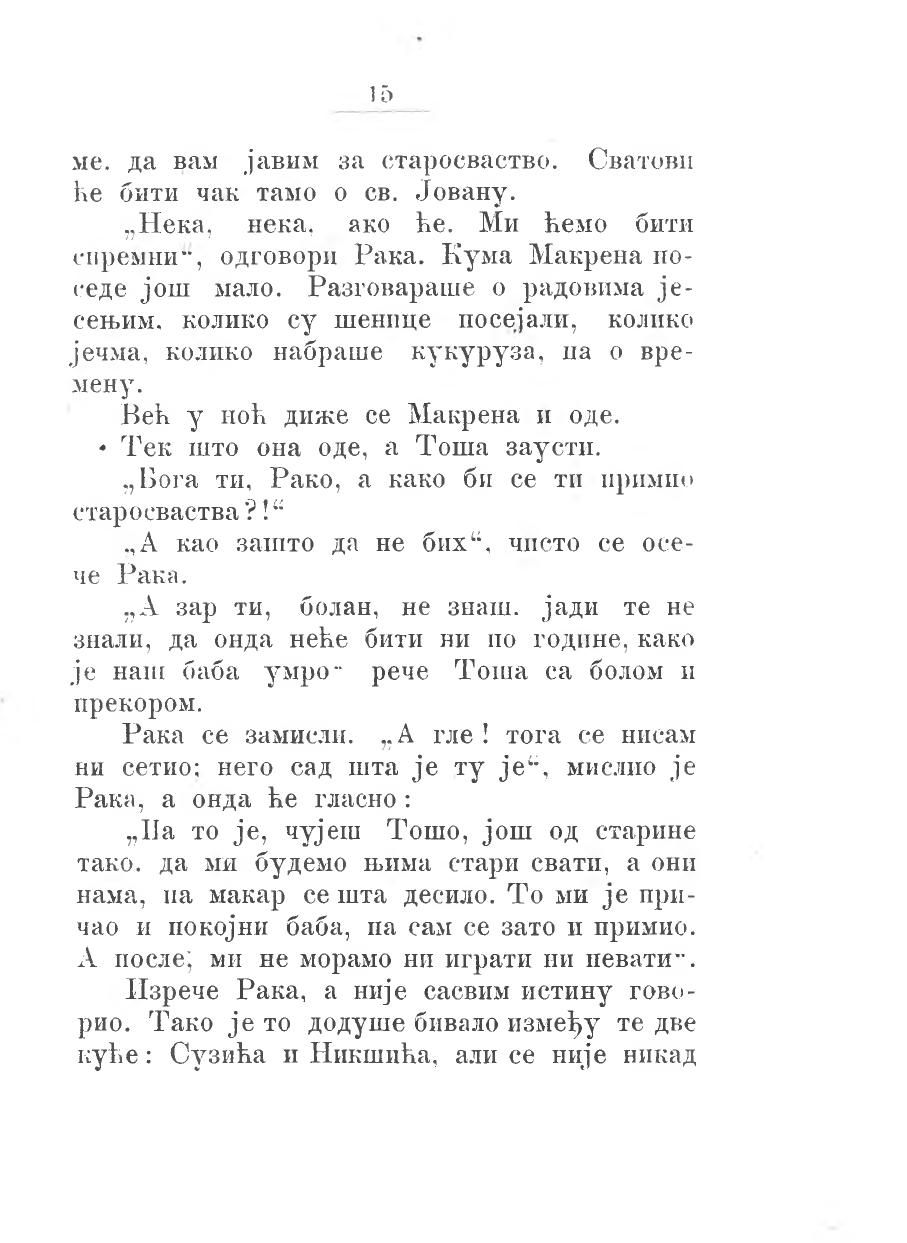 „Нека, нека, ако ће. Ми ћемо бити спремни", одговори Рака. Кума Макрена поседе још мало. Разговараше о радовима јесењим, колико су шенице посејали, колико јечма, колико набраше кукуруза, па о времену.