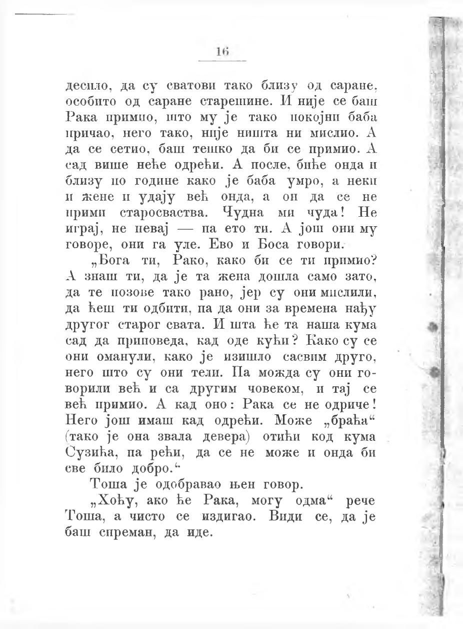 „Бога ти, Рако, како би се ти примио? А знаш ти, да је та жена дошла само зато, да те позове тако рано, јер су они мислили, да ћеш ти одбити, па да они за времена нађу другог старог свата. И шта ће та наша кума сад да приповеда, кад оде кући ? Како су се они оманули, како је изишло сасвим друго, него што су они тели. Па можда су они говорили већ и са другим човеком, и тај се већ примио. А кад оно: Рака се не одриче! Него још имаш кад одрећи. Може „браћа“ (тако је она звала девера) отићи код кума Сузића, па рећи, да се не може и онда би све било добро.“