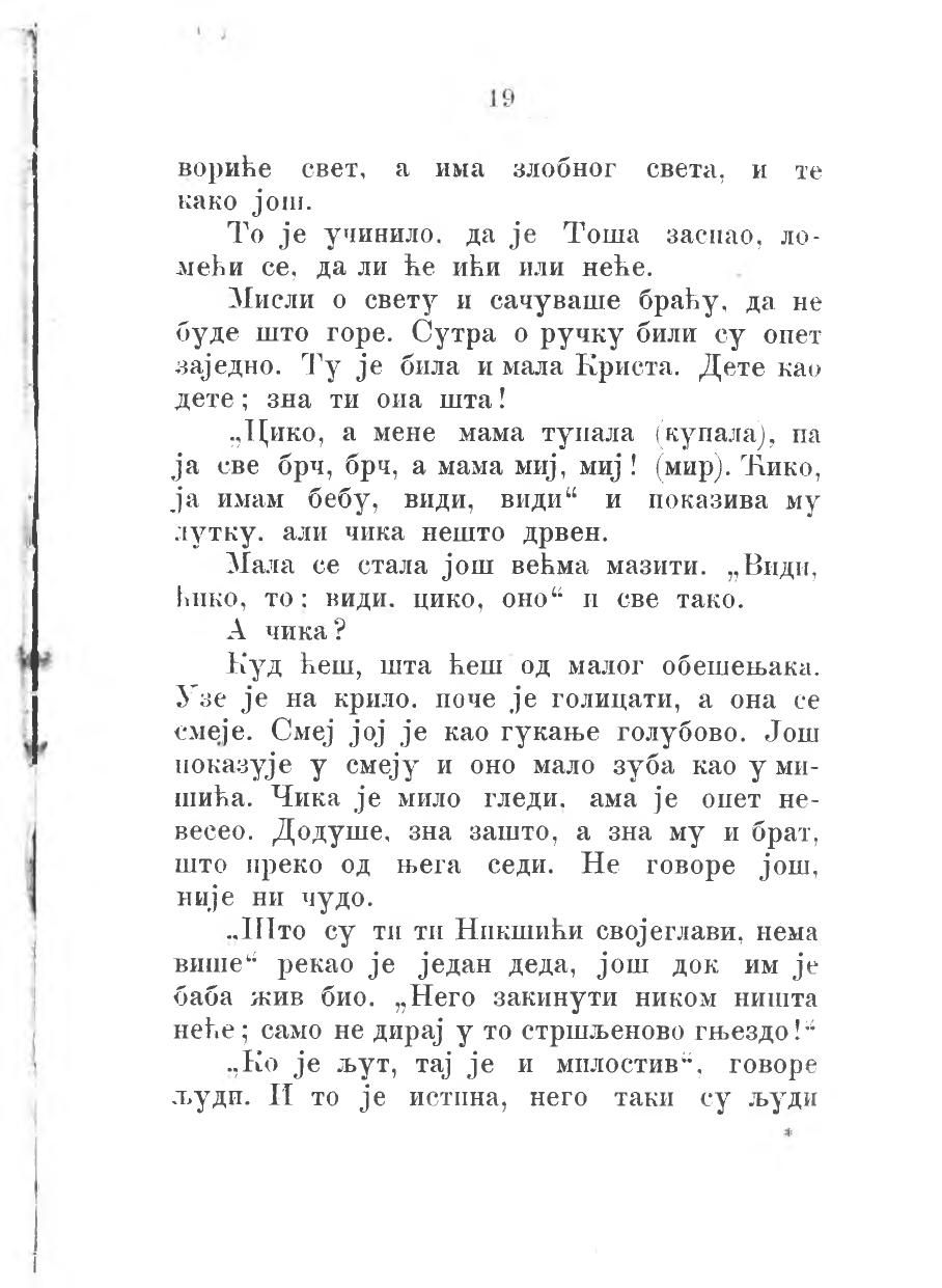 Куд ћеш, шта ћеш од малог обешењака. Узе је на крило, поче је голицати, а она се смеје. Смеј јој је као гукање голубово. Још показује у смеју и оно мало зуба као у мишића. Чика је мило гледи, ама је опет невесео. Додуше, зна зашто, а зна му и брат, што преко од њега седи. Не говоре још, није ни чудо.