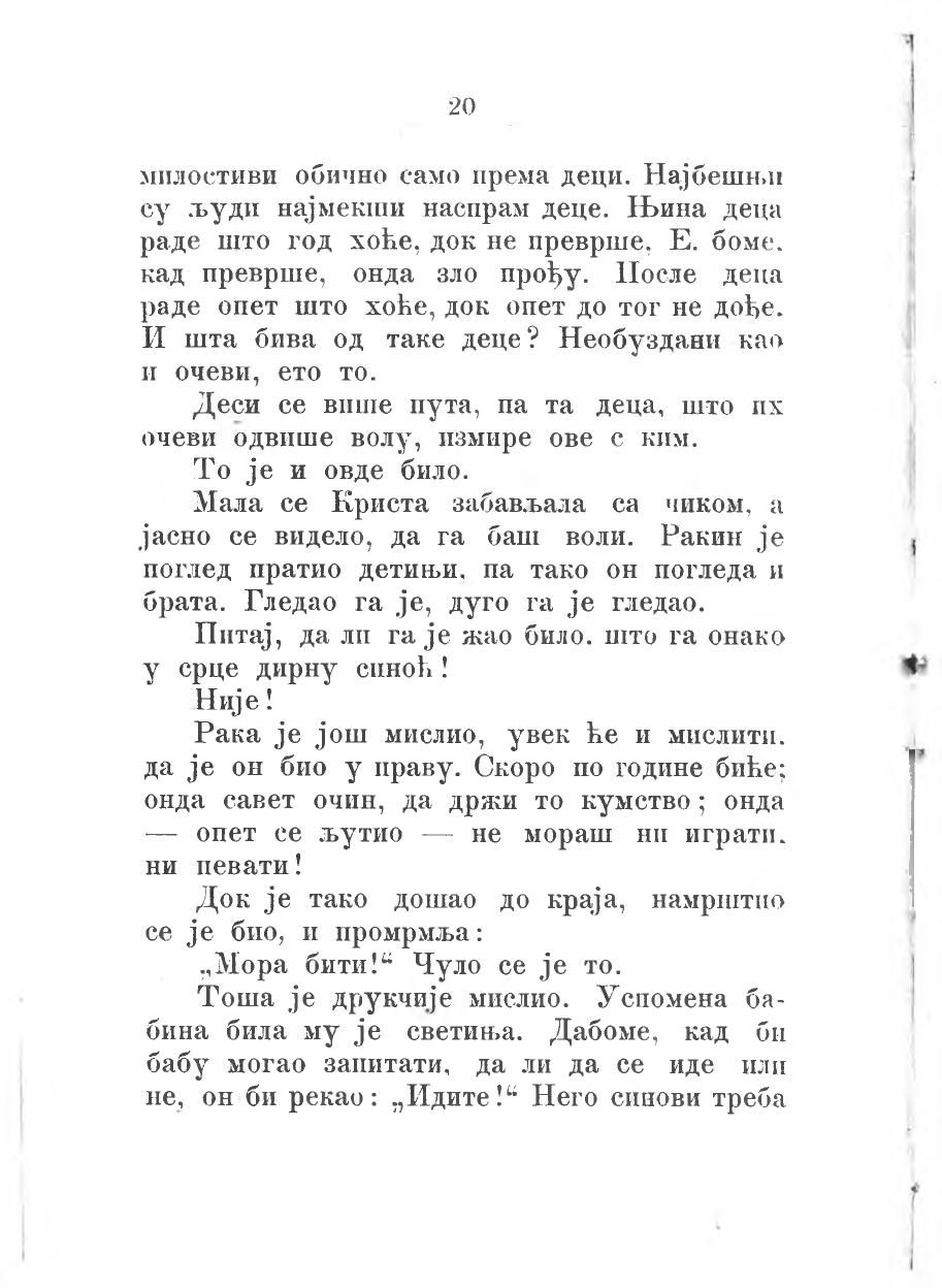 Рака је још мислио, увек ће и мислити, да је он био у праву. Скоро по године биће; онда савет очин, да држи то кумство ; онда — опет се љутио — не мораш ни играти, ни певати!