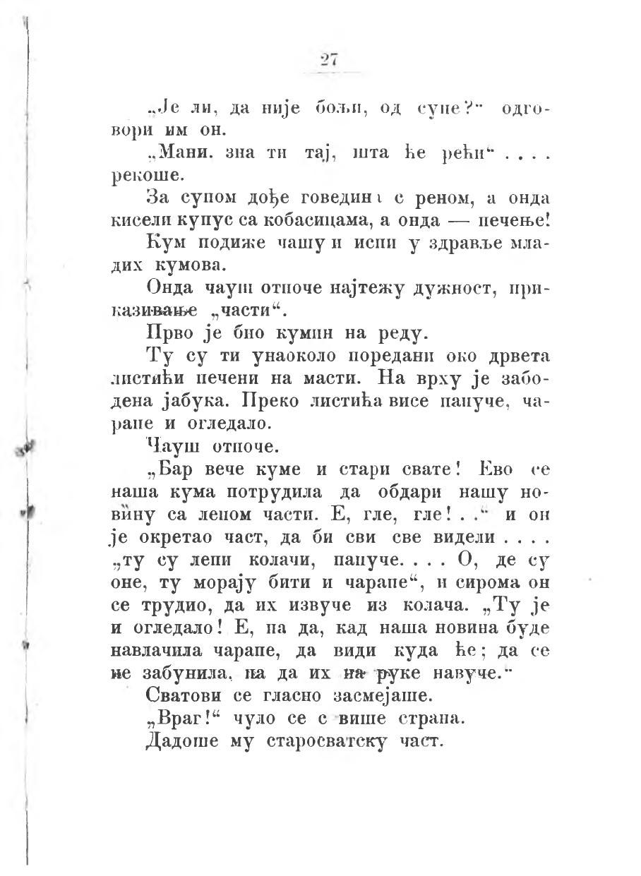 „Бар вече куме и стари свате! Ево се наша кума потрудила да обдари нашу новину са лепом части. Е, гле, гле!..” и он је окретао част, да би сви све видели.... „ту су лепи колачи, папуче.... О, де су оне, ту морају бити и чарапе“, и сирома он се трудио, да их извуче из колача. „Ту је и огледало! Е, па да, кад наша новина буде навлачила чарапе, да види куда ће; да се не забунила, па да их на руке навуче."