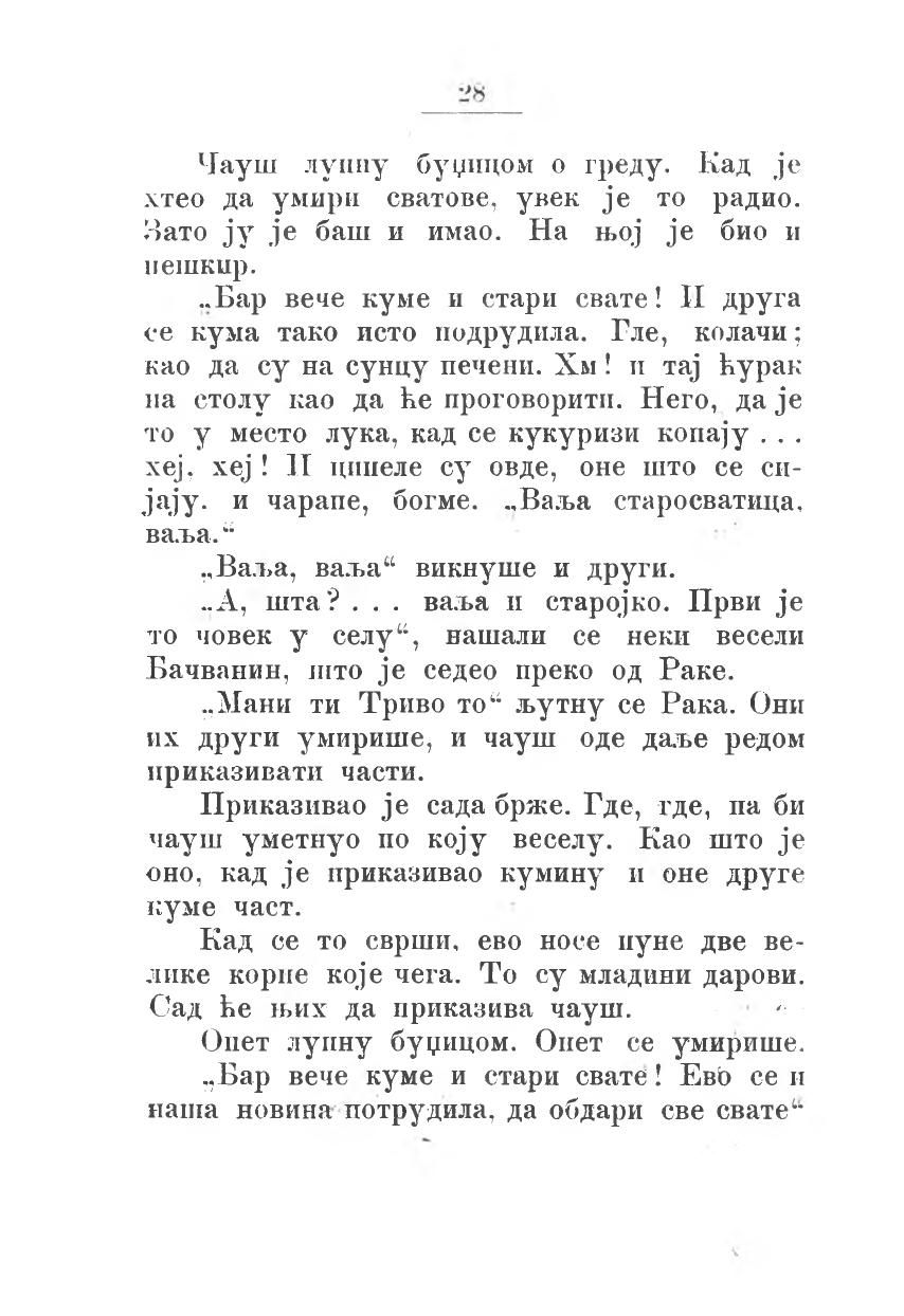 Приказивао је сада брже. Где, где, па би чауш уметнуо по коју веселу. Као што је оно, кад је приказивао кумину и оне друге куме част.
