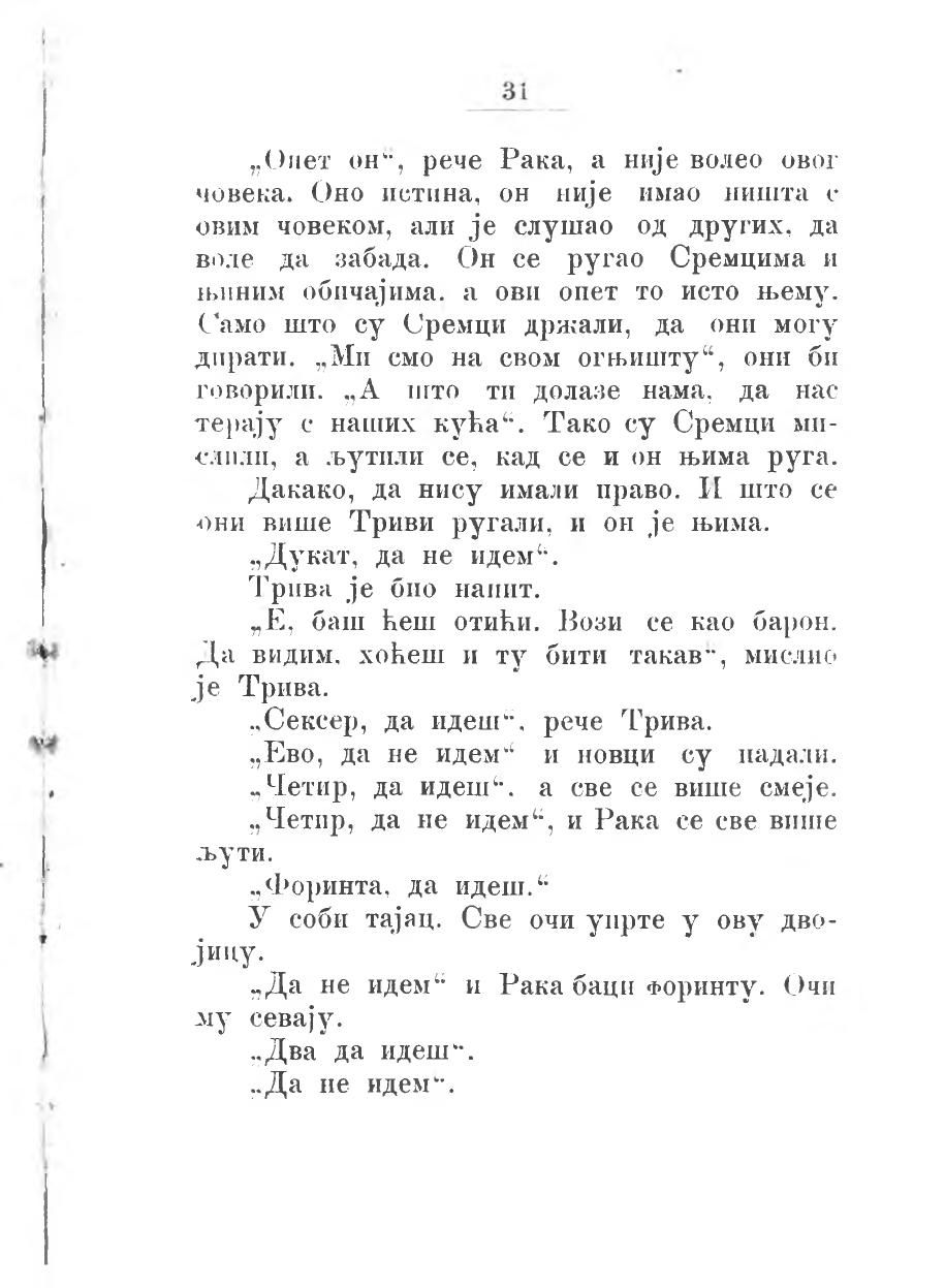 „Опет он", рече Рака, а није волео овог човека. Оно истина, он није имао ништа с овим човеком, али је слушао од других, да воле да забада. Он се ругао Сремцима и и њиним обичајима, а ови опет то исто њему. Само што су Сремци држали, да они могу дирати, „ми смо на свом огњишту“, они би говорили. „А што ти долазе нама, да нас терају с наших кућа“. Тако су Сремци мислили, а љутили се, кад се и он њима руга.
