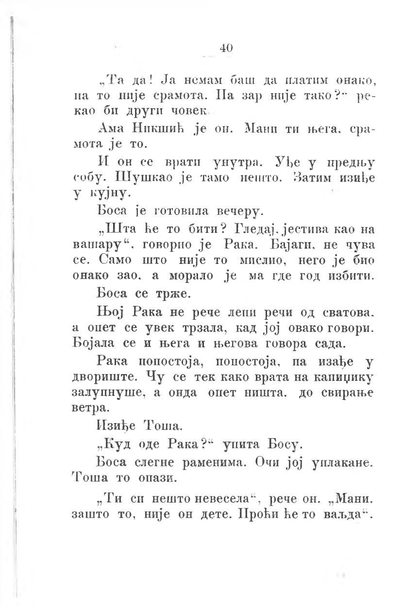 Њој Рака не рече лепи речи од сватова. а опет се увек трзала, кад јој овако говори. Бојала се и њега и његова говора сада.