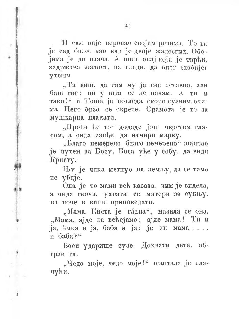 „Ти виш, да сам му ја све оставио, али баш све; ни у шта се не пачам. А ти и тако!" и Тоша је погледа скоро сузним очима. Него брзо се окрете. Срамота је то за мушкарца плакати.