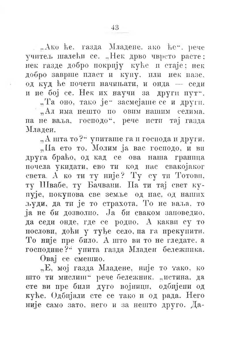 „Па ето то. Молим ја вас господо, и ви друга браћо, од кад се ова наша граница почела укидати, ево ти код нас свакојаког света. А ко ти ту није? Ту су ти Тотови, ту Швабе, ту Бачвани. Па ти тај свет купује, покупова све земље од нас, од наших људи, да ти је то страхота. То не ваља, то ја не би дозволио. Ја би сваком заповедио, да седи онде, где се родио. А какви су то послови, доћи у туђе село, па га прекупити. То није пре било. А што ви то не гледате, а господине?” упита газда Младен бележника.