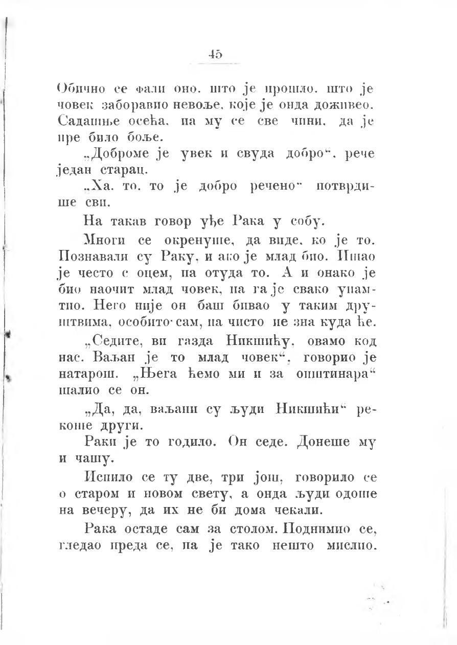 Многи се окренуше, да виде ко је то. Познавали су Раку. Иако је млад био, ишао је често с оцем, па отуда то. А и онако је био наочит млад човек, па га је свако упамтио. Него није он баш бивао у таким друштвима, особито сам, па чисто не зна куда ће.