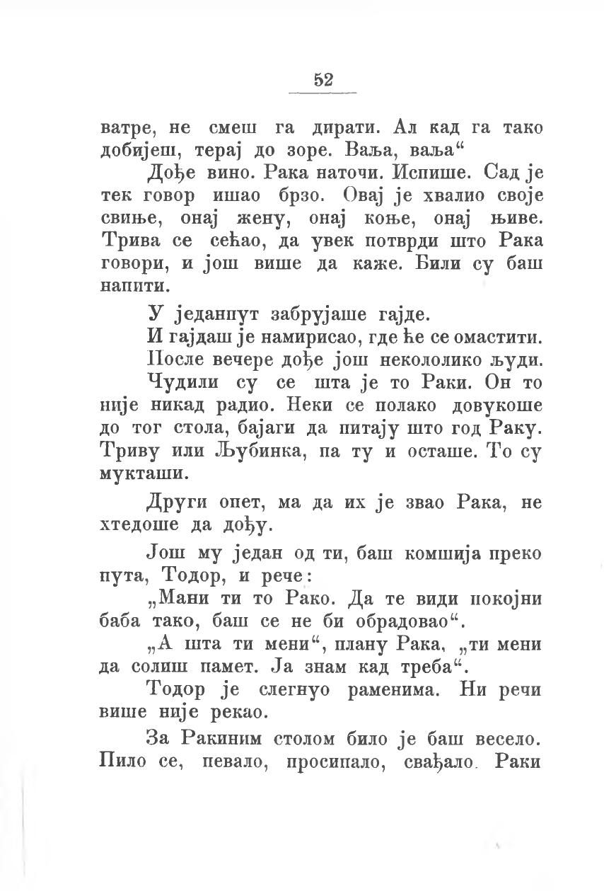 Разговор је текао живље. Вино дреши језик. То се и овде показало. И Рака је почео приповедати. Приповедао је, како је он ишао свуда са бабом. Био је он и у Новом Саду, и у Шапцу, и у Винковцима. Е, да, био је његов баба свуда, а и он са њиме.