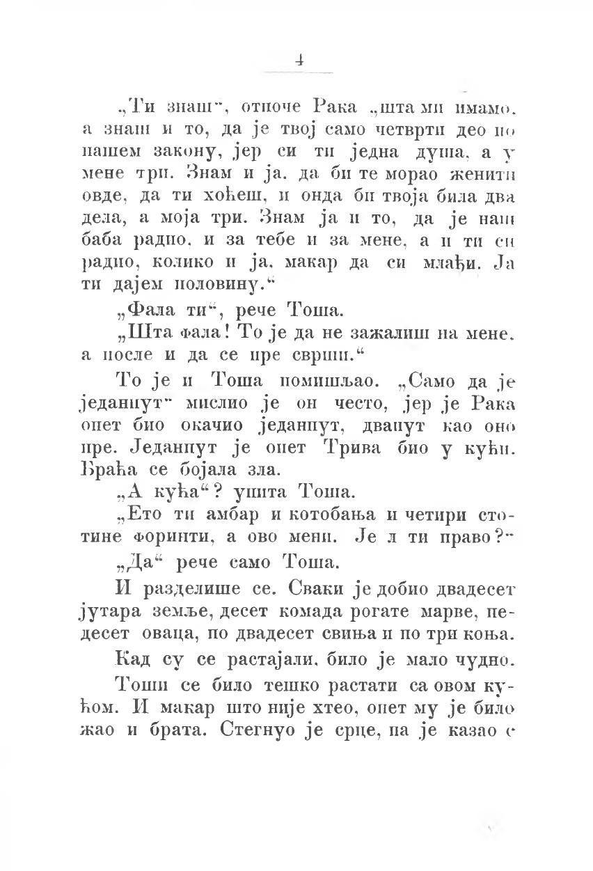 „Ти знаш”, отпоче Рака „шта ми имамо, а знаш и то, да је твој само четврти део по нашем закону, јер си ти једна душа, а у мене три. Знам и ја, да би те морао женити овде, да ти хоћеш, и онда би твоја била два дела, а моја три. Знам ја и то, да је наш баба радио, и за тебе и за мене, а и ти си радио, колико и ја, макар да си млађи. Ја ти дајем половину.“