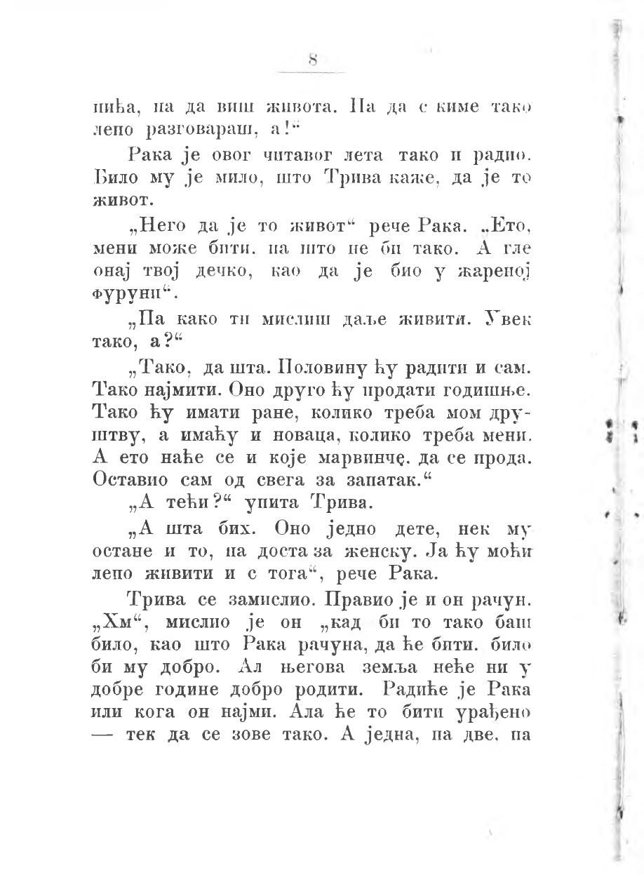 Трива се замислио. Правио је и он рачун. „Хм“, мислио је он „кад би то тако баш било, као што Рака рачуна, да ће бити, било би му добро. Ал његова земља неће ни у добре године добро родити. Радиће је Рака или кога он најми. Ала ће то бити урађено — тек да се зове тако. А једна, па две, па