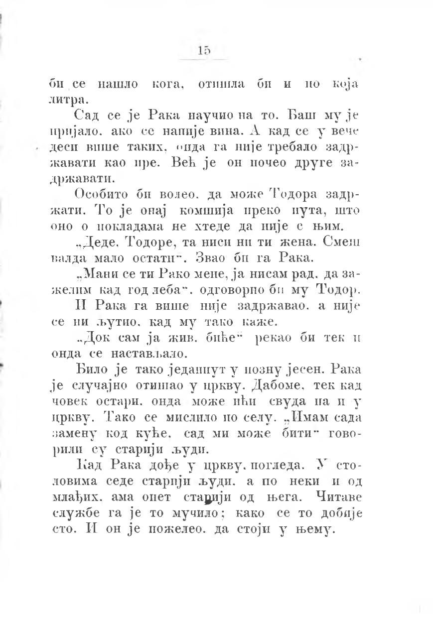 Било је тако једанпут у позну јесен. Рака је случајно отишао у цркву. Дабоме, тек кад човек остари, онда може ићи свуда па и у цркву. Тако се мислило по селу. „Имам сада замену код куће, сад ми може бити” говорили су старији људи.