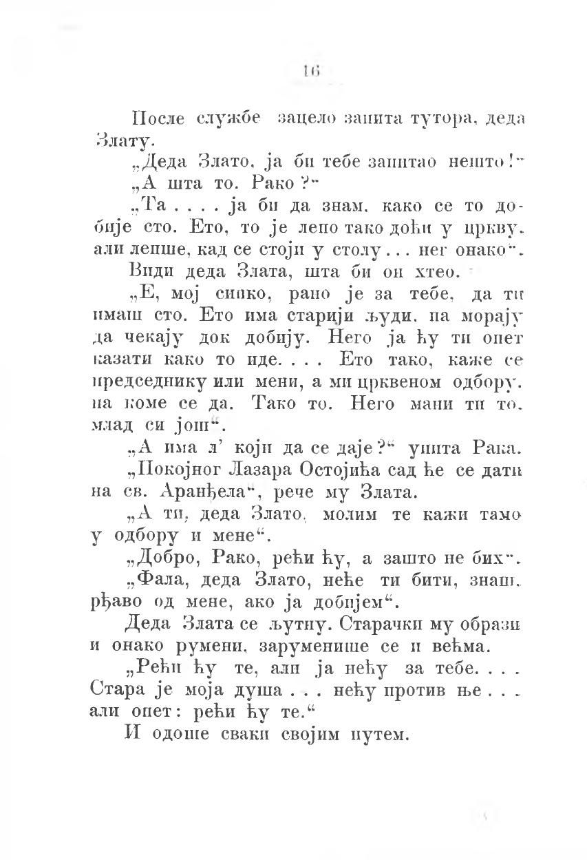 „Е, мој синко, рано је за тебе, да ти имаш сто. Ето има старији људи, па морају да чекају док добију. Него ја ћу ти опет казати како то иде.... Ето тако, каже се председнику или мени, а ми црквеном одбору, па коме се да. Тако то. Него мани ти то, млад си још”.