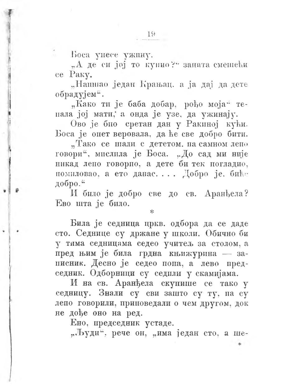 „Тако се шали с дететом. па самном лепо говори“, мислила је Боса. „До сад ми није никад лепо говорио, а дете би тек погладио, помиловао, а ето данас.... Добро је, биће добро.“
