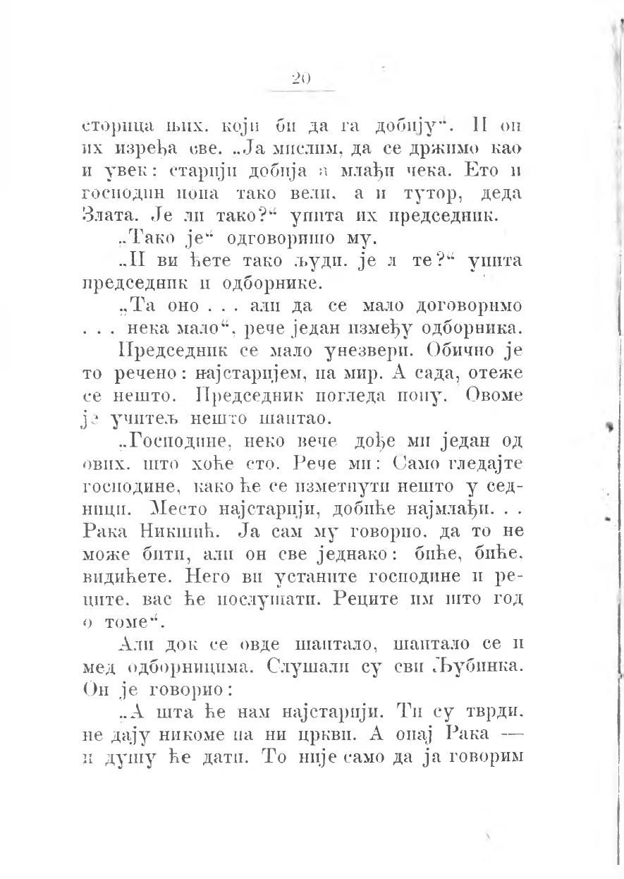 њих, који би да га добију. И он их изређа све... Ја мислим, да се држимо као и увек: старији добија а млађи чека. Ето и господин попа тако вели, а и тутор, деда Злата. Је ли тако?“ упита их председник.