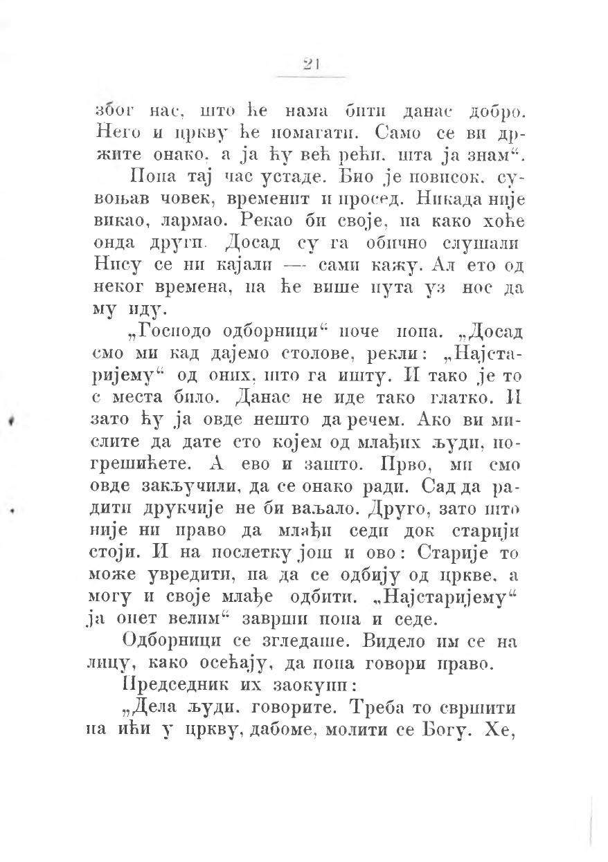 „Господо одборници“ поче попа. „Досад смо ми кад дајемо столове, рекли: „Најстаријему“ од оних, што га ишту. И тако је то с места било. Данас не иде тако глатко. И зато ћу ја овде нешто да речем. Ако ви мислите да дате сто којем од млађих људи, погрешићете. А ево и зашто. Прво, ми смо овде закључили, да се онако ради. Сад да радити друкчије не би ваљало. Друго, зато што није ни право да млађи седи док старији стоји. И на послетку још и ово: старије то може увредити, па да се одбију од цркве, а могу и своје млађе одбити. „Најстаријему“ ја опет велим“ заврши попа и седе.