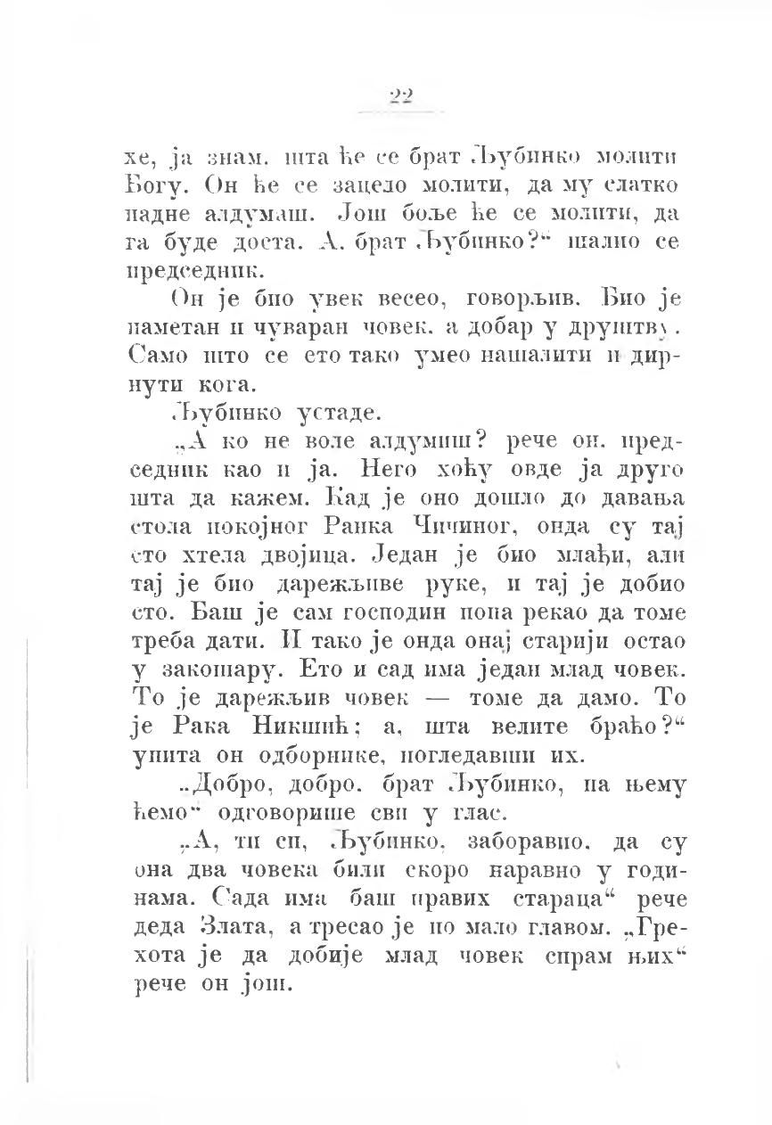 „А ко не воле алдумиш? рече он, председник као и ја. Него хоћу овде ја друго шта да кажем. Кад је оно дошло до давања стола покојног Ранка Чичиног, онда су тај сто хтела двојица. Један је био млађи, али тај је био дарежљиве руке, и тај је добио сто. Баш је сам господин попа рекао да томе треба дати. И тако је онда онај старији остао у закошару. Ето и сад има један млад човек. То је дарежљив човек — томе да дамо. То је Рака Никшић; а, шта велите браћо?“ упита он одборнике, погледавши их.