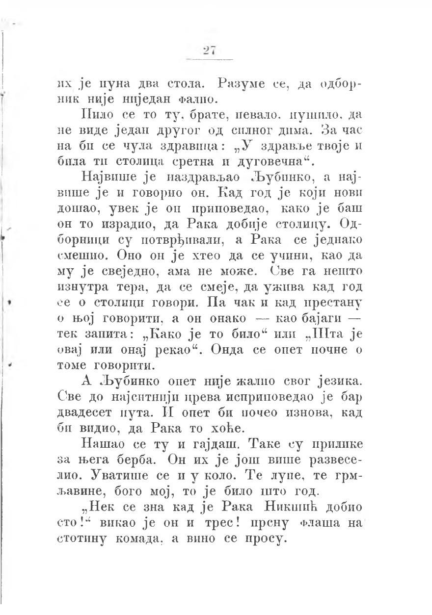 А Љубинко опет није жалио свог језика. Све до најситнији црева исприповедао је бар двадесет пута. И опет би почео изнова, кад би видио, да Рака то хоће.