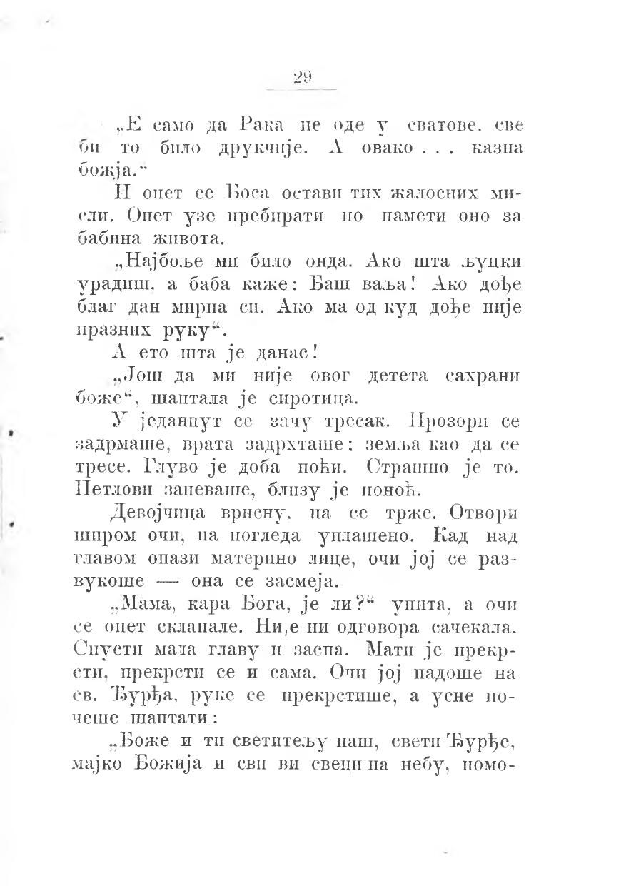 „Мама, кара Бога, је ли?“ упита, а очи се опет склапале. Није ни одговора сачекала. Спусти мала главу и заспа. Мати је прекрсти, прекрсти се и сама. Очи јој падоше на св. Ђурђа, руке се прекрстише, а усне почеше шаптати: