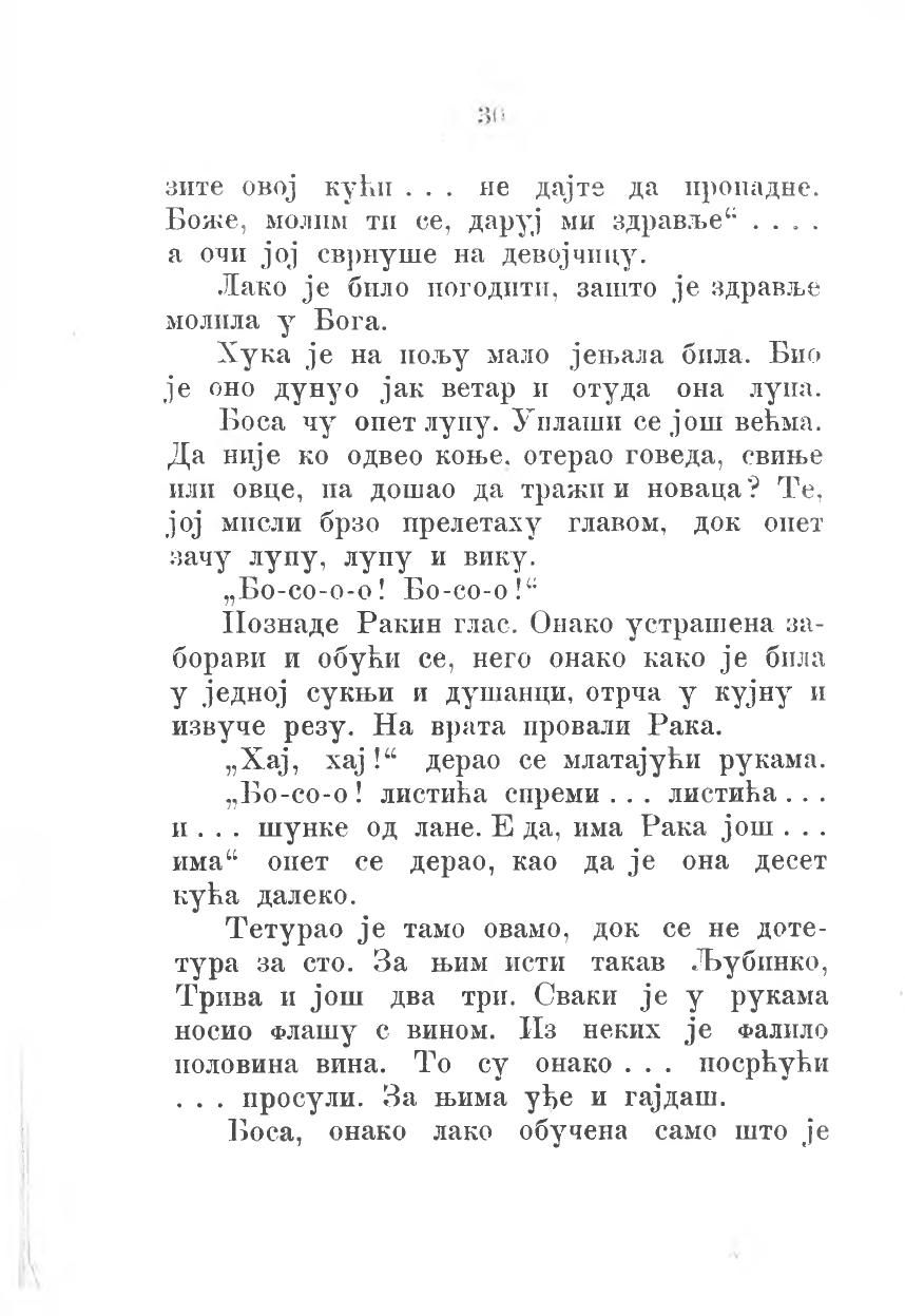 Боса чу опет лупу. Уплаши се још већма. Да није ко одвео коње, отерао говеда, свиње или овце, па дошао да тражи и новаца? Те, јој мисли брзо прелетаху главом, док опет зачу лупу, лупу и вику.