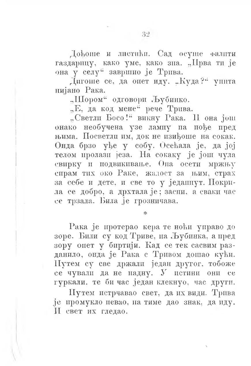 „Светли Босо!“ викну Рака. И она још онако необучена узе лампу па пође пред њима. Посветли им, док не изиђоше на сокак. Онда брзо уђе у собу. Осећала је, да јој телом пролази језа. На сокаку је још чула свирку и подвикивање. Она осети мржњу спрам тих око Раке, жалост за њим, страх за себе и дете, и све то у једанпут. Покрила се добро, а дрхтала је; заспи, а сваки час се трзала. Била је грозничава.