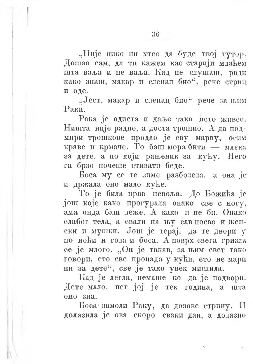 То је била прва невоља. До Божића је још које како прогурала онако све с ногу, ама онда баш леже. А како и не би. Онако слабог тела, а свали на њу сав посао и женски и мушки. Још је терај, да те двори у по ноћи и гола и боса. А поврх свега гризла се је млого. „Он је такав, за њим свет тако говори, ето све пропада у кући, ето не мари ни за дете“, све је тако увек мислила.