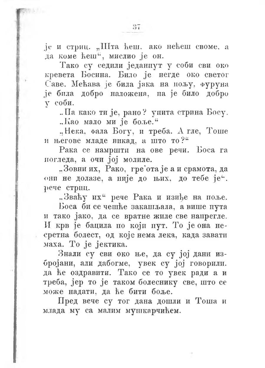 Боса би се чешће закашљала, а више пута и тако јако, да се вратне жиле све напрегле. И крв је бацила по који пут. То је она несретна болест, од које нема лека, када завати маха. То је јектика.