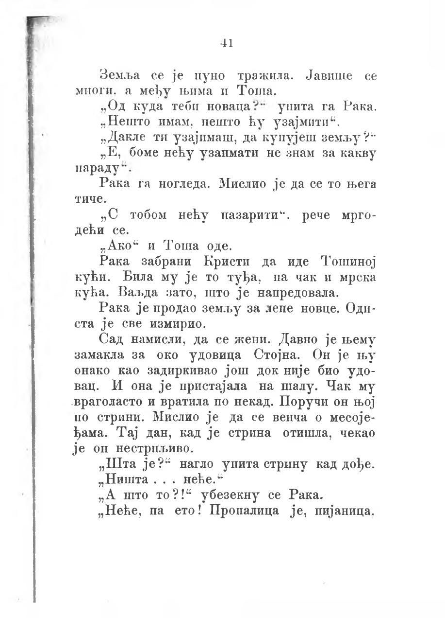 Сад намисли, да се жени. Давно је њему замакла за око удовица Стојна. Он је њу онако као задиркивао још док није био удовац. И она је пристајала на шалу. Чак му враголасто и вратила по некад. Поручи он њој по стрини. Мислио је да се венча о месојеђама. Тај дан, кад је стрина отишла, чекао је он нестрпљиво.