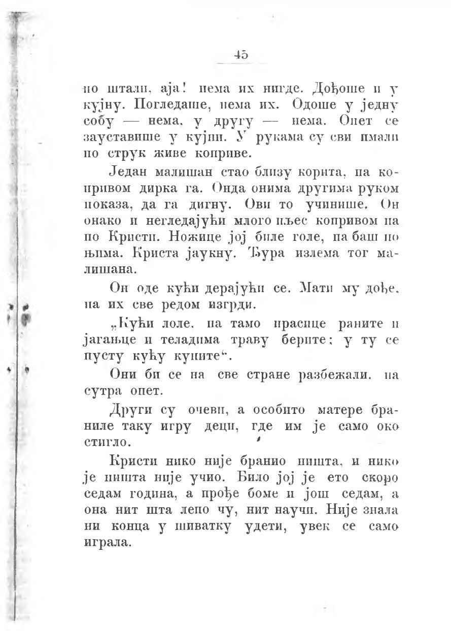 Кристи нико није бранио ништа, и нико је ништа није учио. Било јој је ето скоро седам година, а прође боме и још седам, а она нит шта лепо чу, нит научи. Није знала ни конца у шиватку удети, увек се само играла.