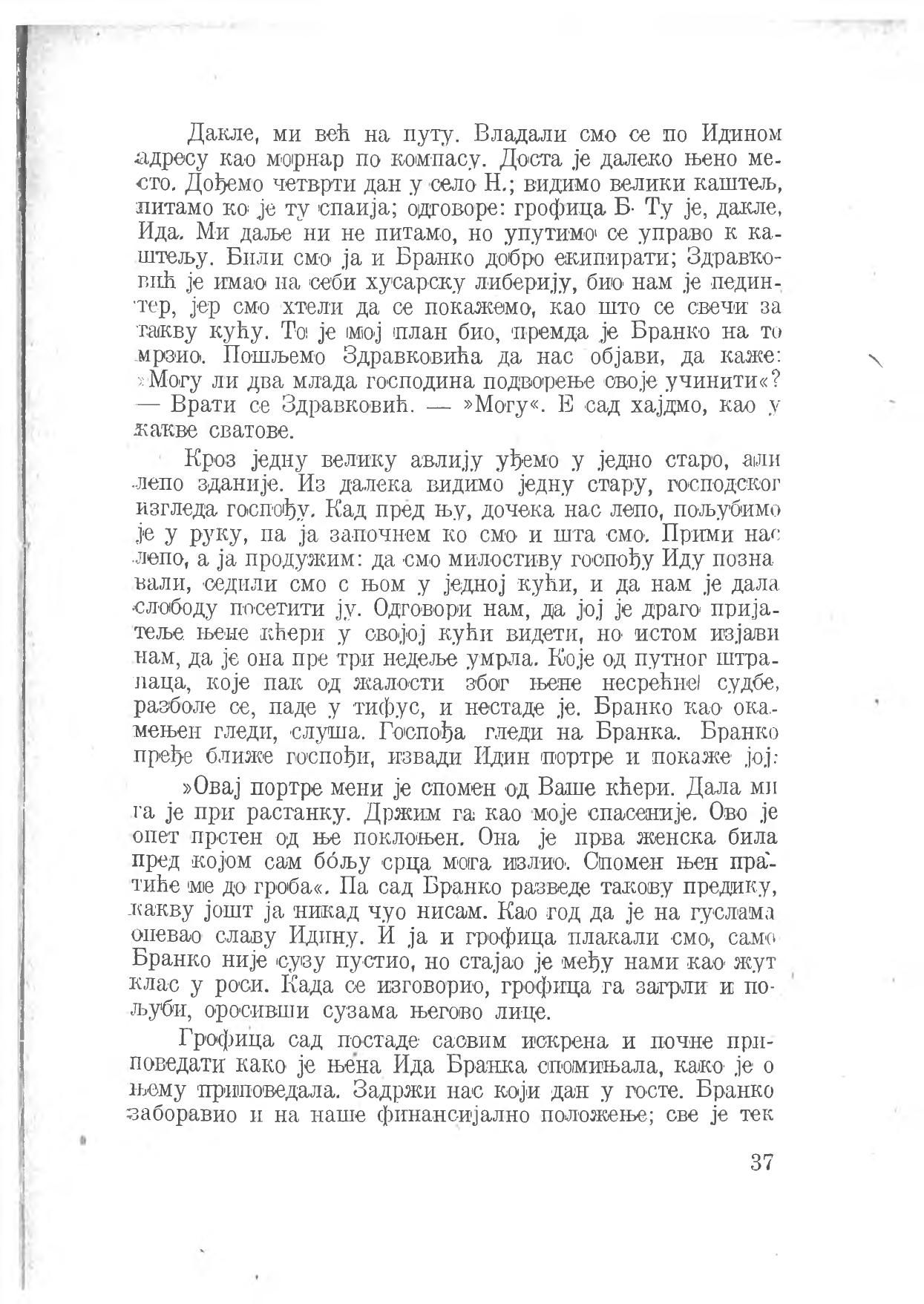 Грофица сад постаде сасвим искрена и почне приповедати како је њена Ида Бранка спомињала, како је о њему приповедала. Задржи нас који дан у госте. Бранко заборавио и на наше финансијално положење; све је тек