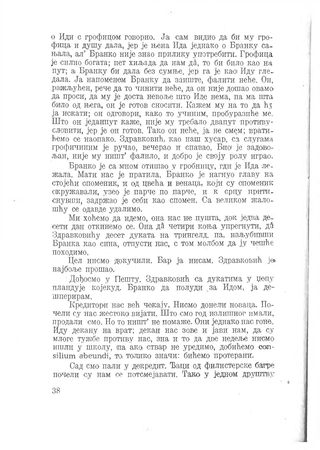 о Иди с грофицом говорио. Ја сам видио да би му грофица и душу дала, јер је њена Ида једнако о Бранку сањала, ал’ Бранко није знао прилику употребити. Грофица је силно богата; пет хиљада да нам да, то би било као на пут; а Бранку би дала без сумње, јер га је као Иду гледала. Ја напоменем Бранку да заиште, фалити неће. Он, ражљућен, рече да то чинити неће, да он није дошао овамо да проси, да му је доста невоље што Иде нема, па ма шта било од њега, он је готов сносити. Кажем му на то да ћу ја искати; он одговори, како то учиним, пробуразиће ме. Што он једанпут каже, није му требало двапут противусловити, јер је он готов. Тако он неће, ја не смем; вратићемо се наопако. Здравковић, као наш хусар, са слугама грофичиним је ручао, вечерао и спавао. Био је задовољан, није му ништ’ фалило, и добро је своју ролу играо.